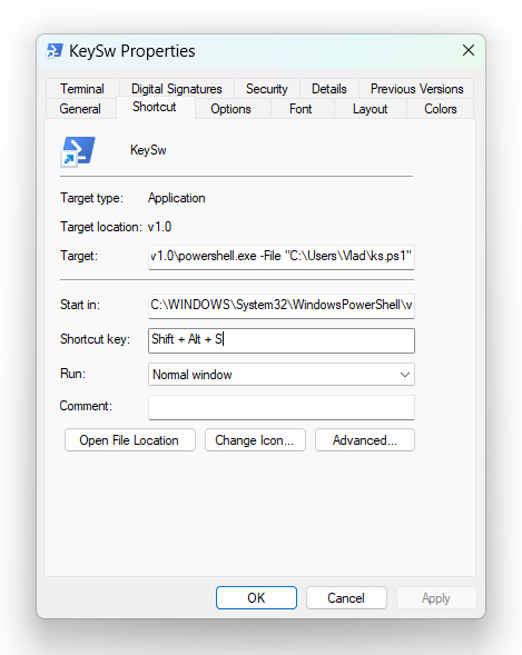 Скрипт на PowerShell (расширение .ps1) лаконичен и выполняет свои функции на все 100%. Единственное, что скрипт нужно как-то вызывать при нажатии нужной комбинации кнопок. В Windows единственным способом вызвать скрипт или программу без привлечения внешних средств является способ создания ярлыка для скрипта и назначение ему комбинации клавиш. В качестве вызываемой программы используем примерно следующую строку: C:\Windows\System32\WindowsPowerShell\v1.0\powershell.exe -File "C:\Users\xxx\ks.ps1". Второй параметр как раз и указывает местоположение скрипта.