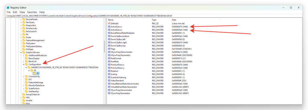Предложений и гипотез было обсуждено много, но коллективным разумом удалось-таки докопаться до конкретного места, где и порылась изюминка. Ей оказалась ветка реестра, предназначенная для настроек видеоадаптера Computer\HKEY_LOCAL_MACHINE\SYSTEM\CurrentControlSet\Control\GraphicsDrivers\Configuration\. В ней операционная система хранит настройки для каждого из мониторов, включая виртуальные устройства (например, различные варианты удаленного доступа к рабочему столу).