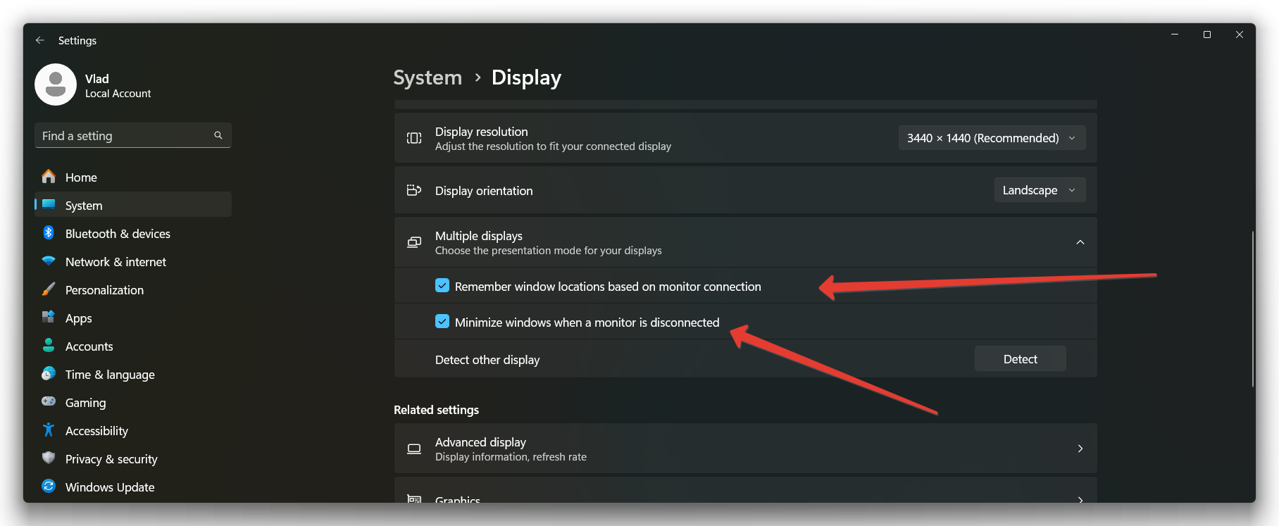 В таком случае на каждый из мониторов в реестре должна присутствовать своя группа ключей. Плюс в самой операционной системе для пользователя доступны две настройки в настройках дисплея. Отвечают они за запоминание положения окна на конкретном мониторе при его подключении и за минимизацию окон при его отключении. В этом случае минимизация позволяет изменить размер окна при насильственном его переносе на рабочий стол на другом мониторе.