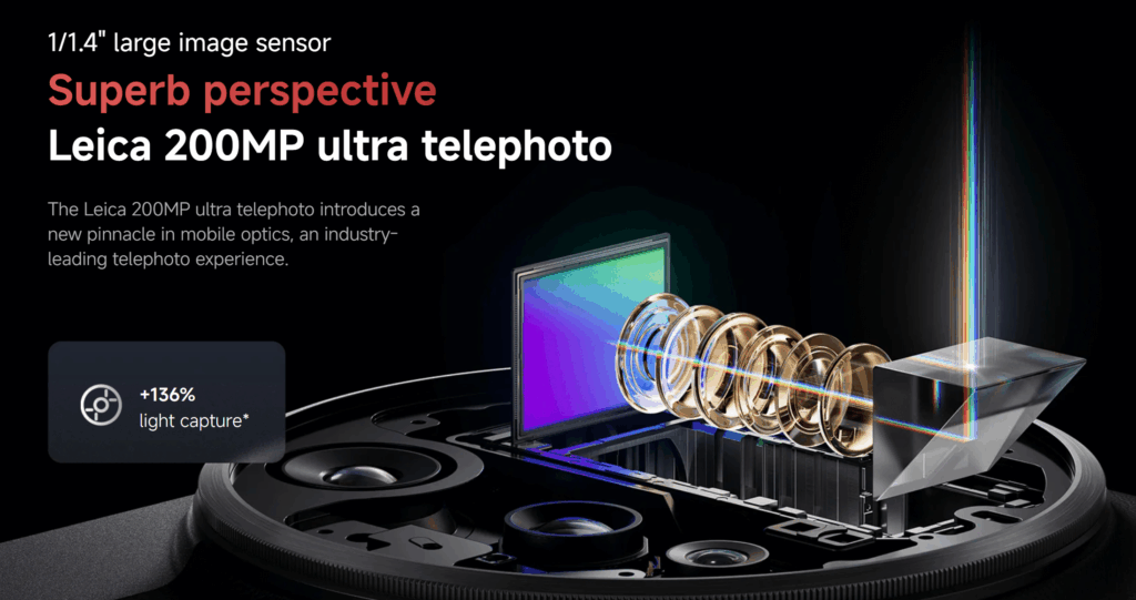 Телефото 100: Leica 100 mm Ultra Telephoto, 200 MP, SAMSUNG - S5KHP9 1/1.4", 2.24 μm Super Pixel, f/2.6