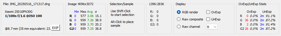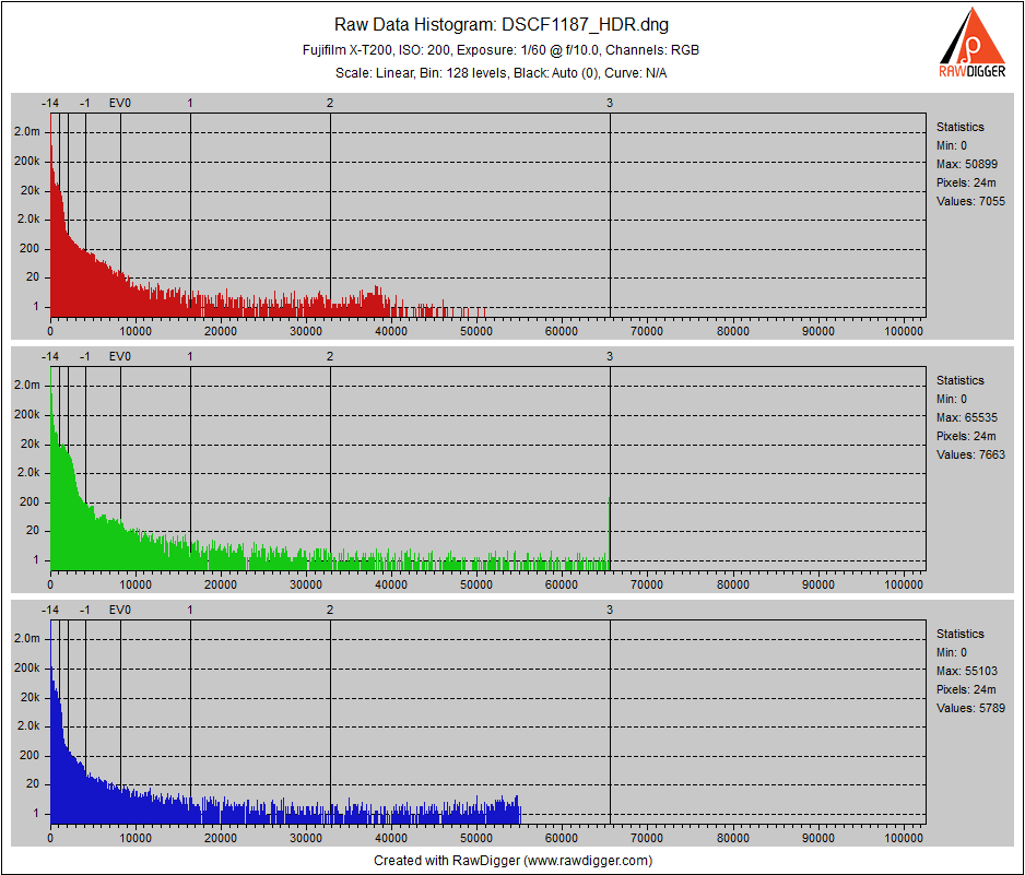 Следует обратить внимание на количество переэкспонированных и недоэкспонированных пикселей на фотографии по каналам. Их, в целом, не так уж и много, тем более что из 15 стопов можно попытаться хоть что-то вытянуть. Попробуем.