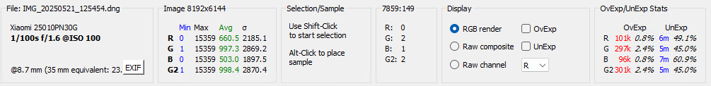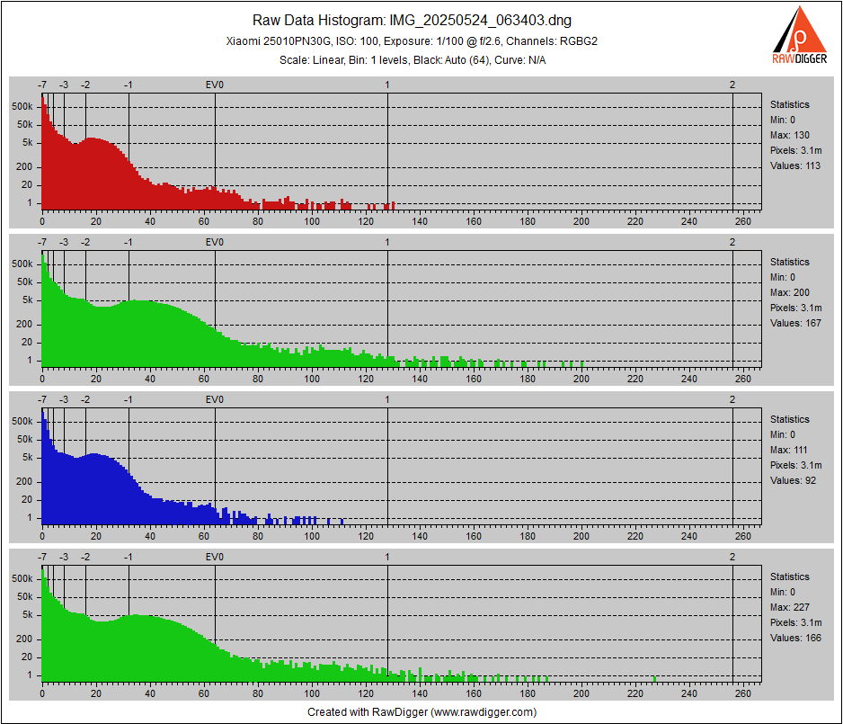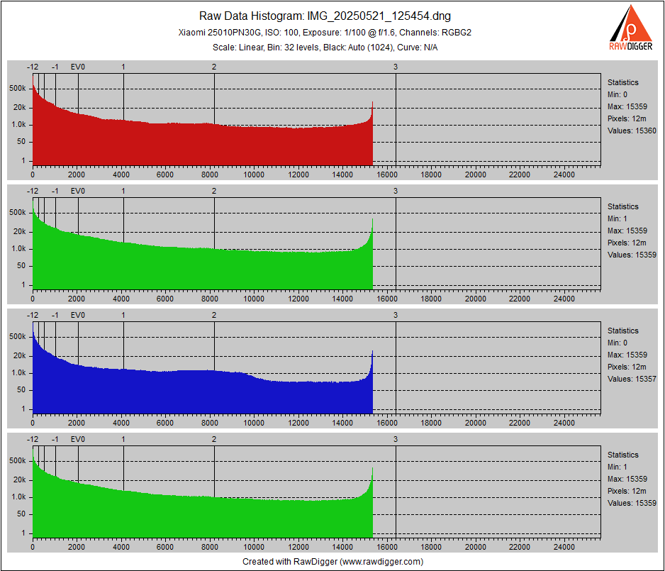 Честно говоря, я не ожидал какого-то чуда, но оно пропотело (как любил писать Лукьяненко) при помощи алгоритмов RawDigger мне удалось насчитать 15 стопов динамического диапазона. Аналогичное значение можно получить и по цифрам максимального и минимального значений. Для 15 стопов динамического диапазона они помещаются в пределах от 0 и до 16384.