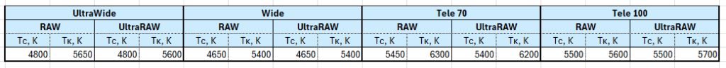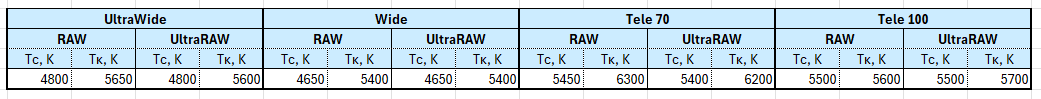 В измерениях можно отметить, что цветовая температура снимков находилась в основном в диапазоне 4500–5500 Кельвинов, что довольно близко к рекомендуемым значениям для съемки. Но, с другой стороны странно видеть разброс между кадрами снятыми с разных камер в целых 1000 К, особенно с учетом того, что в смартфон встроен отдельный 13-канальный фотометрический сенсор, он совмещен со вспышкой в верхней части блока камер, и для всех камер он должен давать одну и туже температуру баланса белого, что, очевидно не так. Также очевидно, что при подстройке баланса белого по плашке 21 серый цвет на фотоснимке более серый, нежели на самих плашках. Различия по оттенкам между RAW и UltraRAW присутствуют, но они ниже порога, который может различить глазом человек. При одинаковой освещенности формула для расчета показателя различимости будет следующей: ΔE=√[(*a1-*a2)^2+(*b1-*b2)^2]. А пороги различимости определим так:
