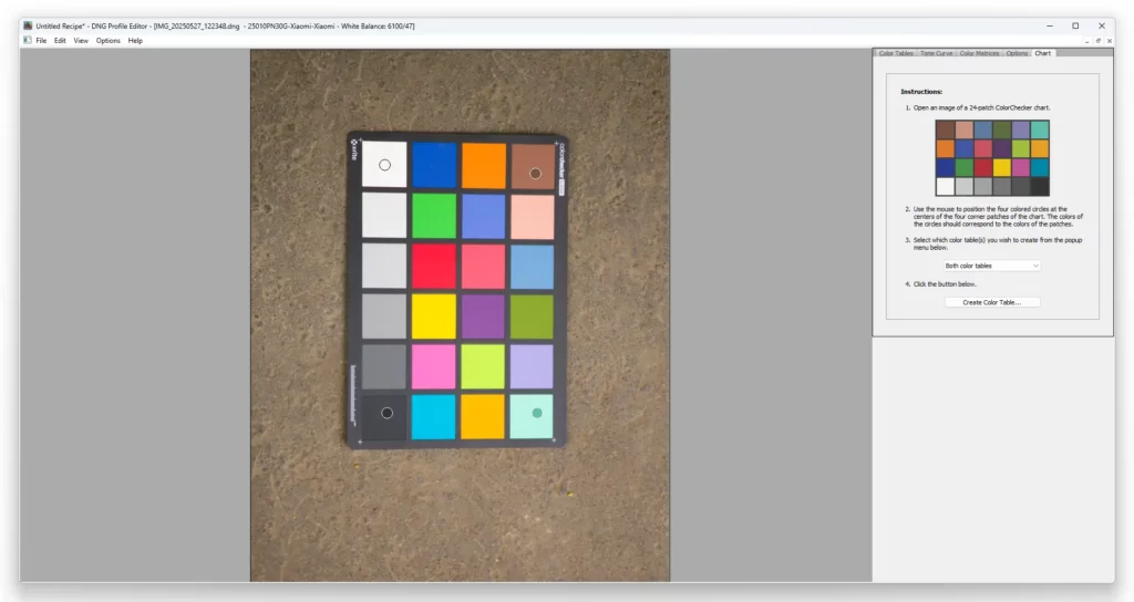 Методика измерения: файл DNG открывается в Adobe Photoshop 2025, предварительно вручную выставляется баланс белого по плашке номер 21 (нейтральный 6.5). При открытии игнорируем предложение применения встроенного цветового профиля из загружаемого файла. Затем при помощи инструмента «Пипетка» с усреднением точек 11 на 11 осуществляем измерение цвета в координатах LAB. Используем 32-битные значения. Они заносятся в таблицу Excel, а затем производится сравнение с эталонными значениями и прочие математические манупуляции.