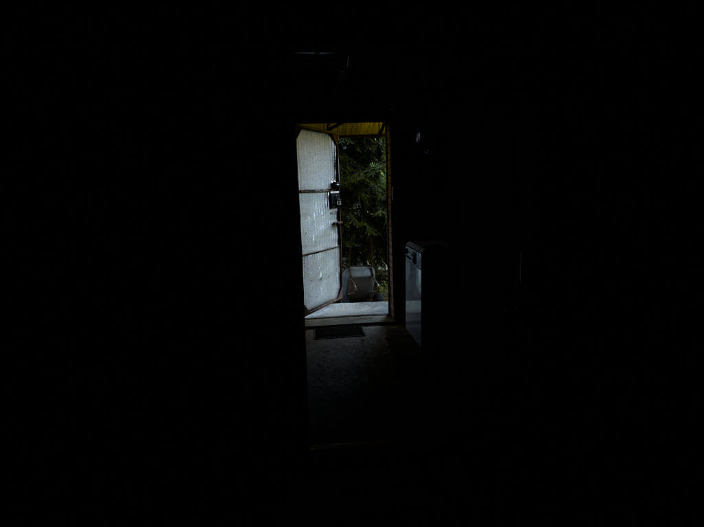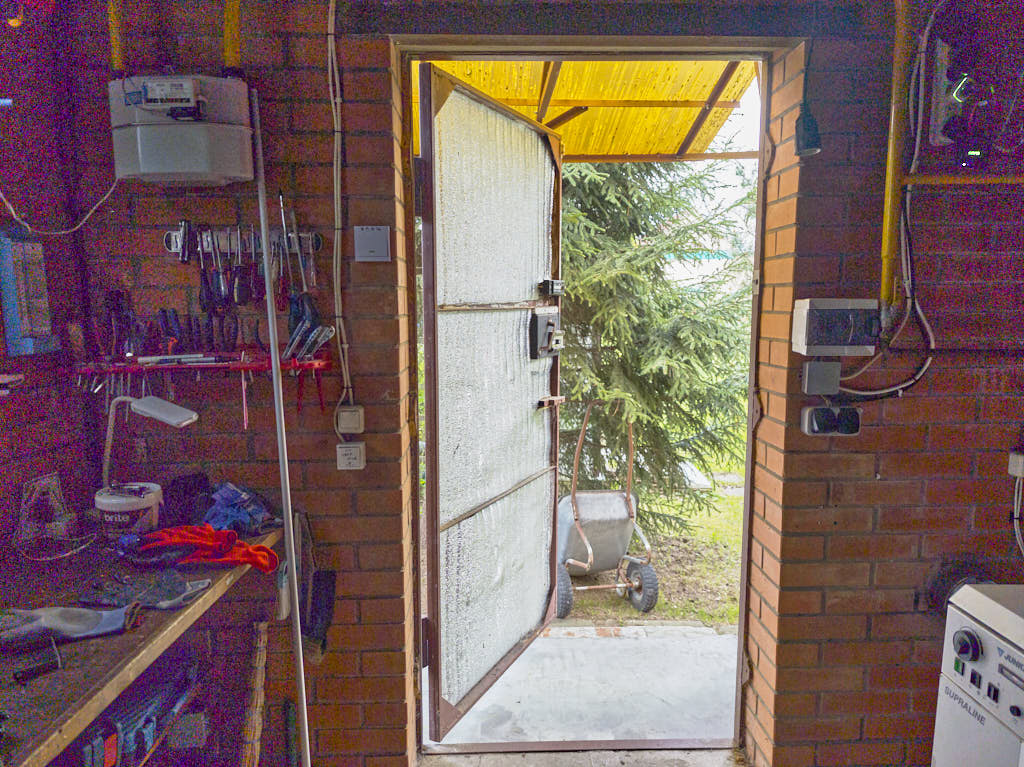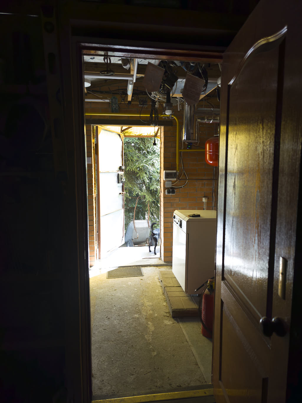 Кадр первый. Снято в режиме RAW с фиксированной экспозицией: ISO 100, выдержка 1/100, диафрагма f/1.63, разрешение 12.5 мегапикселей. Изображен вид из темного гаража на улицу с дневным светом.