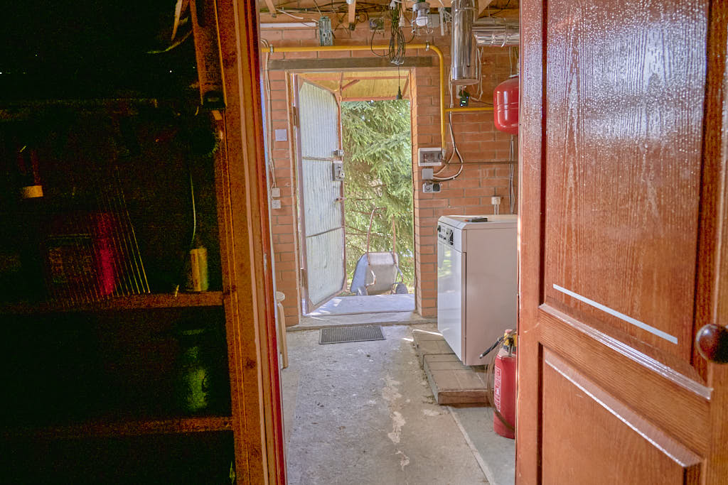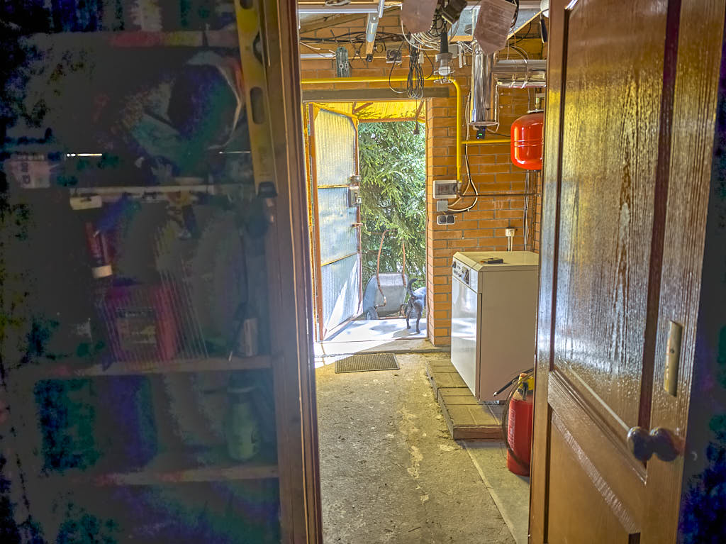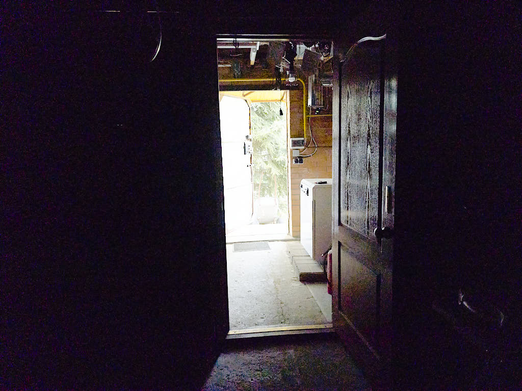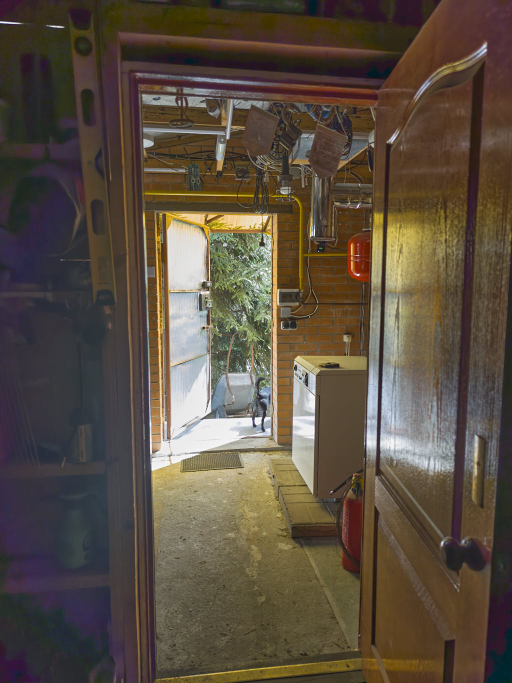 Кадр первый. Снято в режиме RAW с фиксированной экспозицией: ISO 100, выдержка 1/100, диафрагма f/1.63, разрешение 12.5 мегапикселей. Изображен вид из темного гаража на улицу с дневным светом.