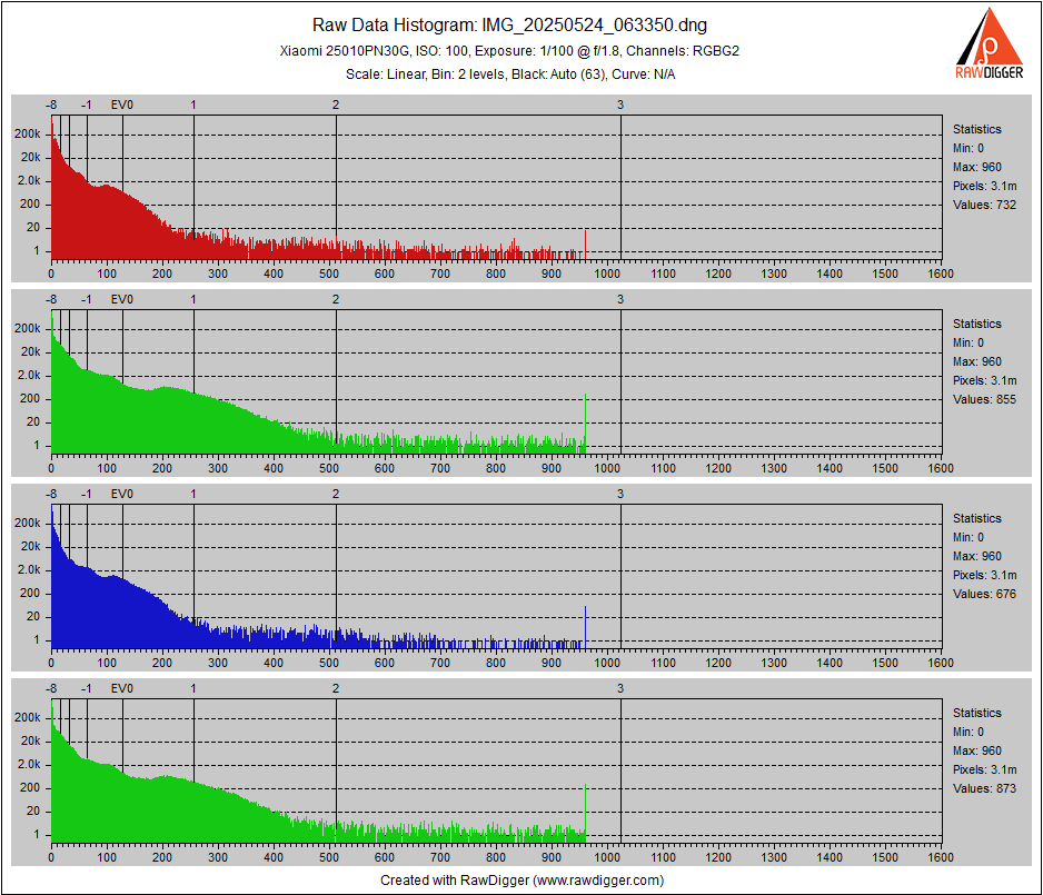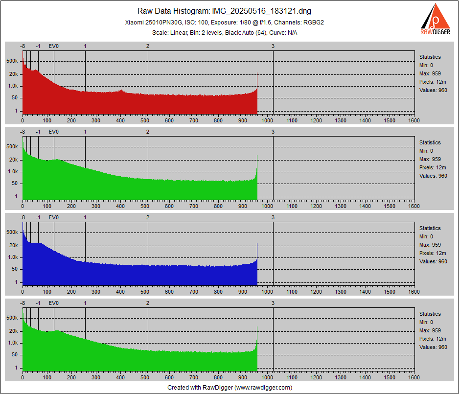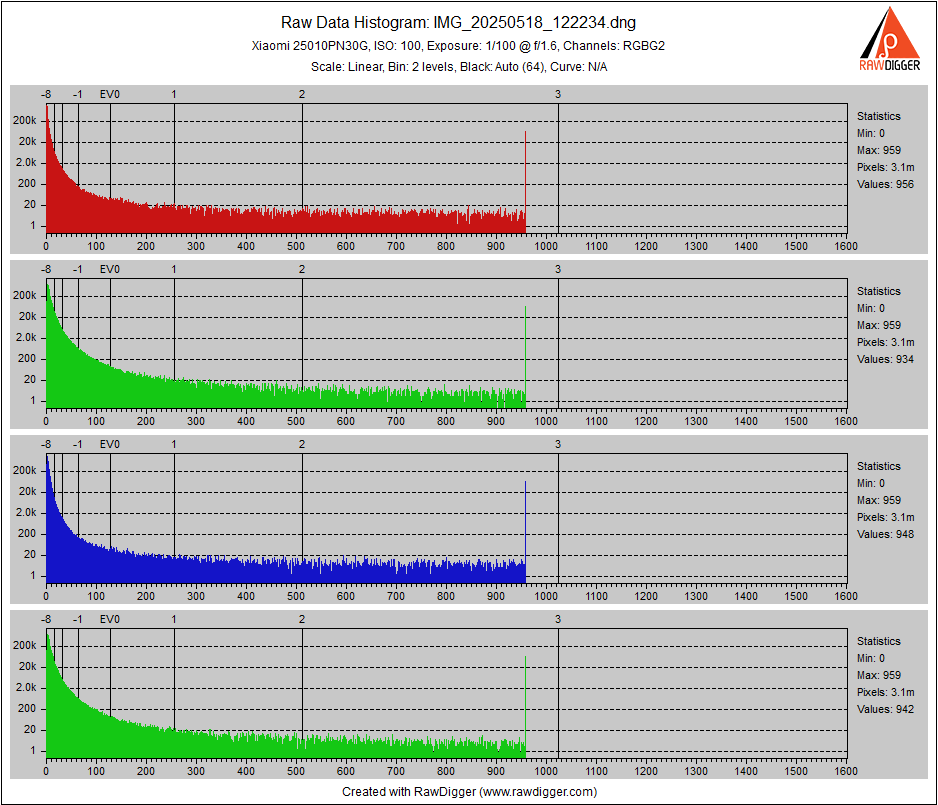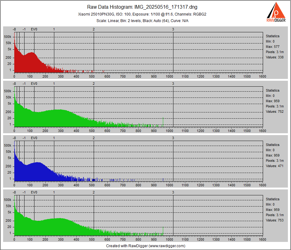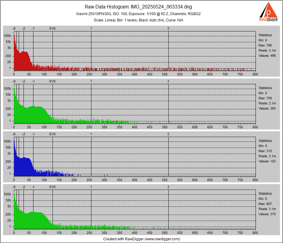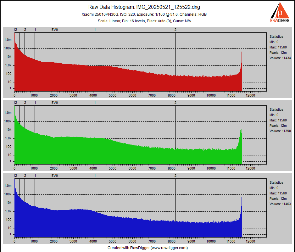 RawDigger дает нам те же 15 стопов динамического диапазона. Почти 15, скорее 14,6, а не ровно 15. Вероятно, что производитель решил себя обезопасить и подстраховался от особо въедливых пользователей любителей судебных тяжб и бесполезных срачей в сети, объявив максимум в 14EV. Обратите внимание, что на этой диаграмме уже три цветовых канала, а не четыре, как на всех предыдущих диаграммах. Сработала магия UltraRAW.
