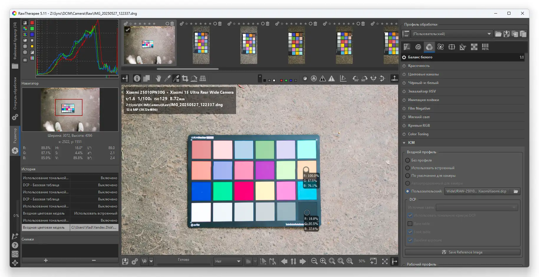 Да, цветопередача у Xiaomi 15 Ultra далеко не идеальна, даже если снимать в JPG с внутрикамерным преобразованием, то результирующий снимок весьма далек по цвету от того, что же было снято изначально. Встроенные корректирующие профили не дают исчерпывающей информации о необходимых корректировках, поэтому приходится крутить руками, полагаясь только на свой собственный вкус и уповая на правильность отображения цветов монитором, либо, вспоминая старину Маргулиса, работать исключительно по цифрам. На этом фоне, казалось бы, пользы от создаваемых профилей особо нет, если все равно надо крутить руками. Однако в построенных профилях все же есть определенный резон. Они позволяют существенно ускорить процесс «проявки» цифровых негативов.
