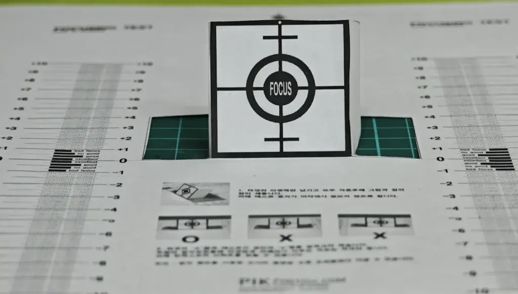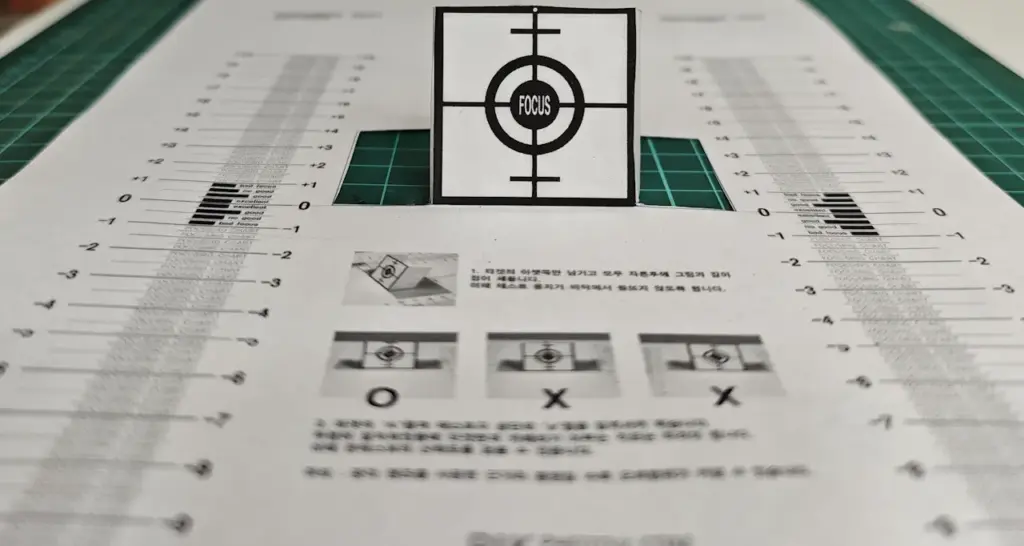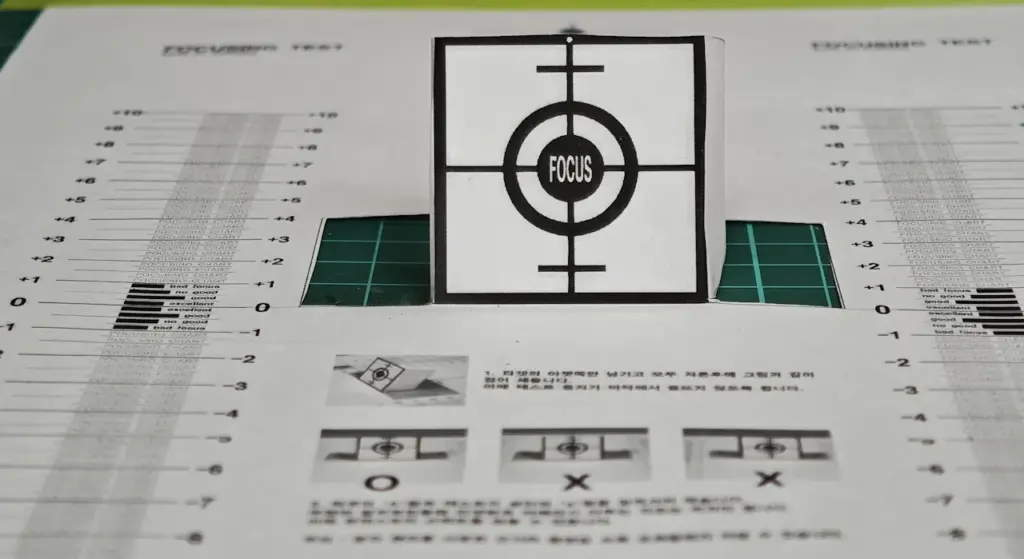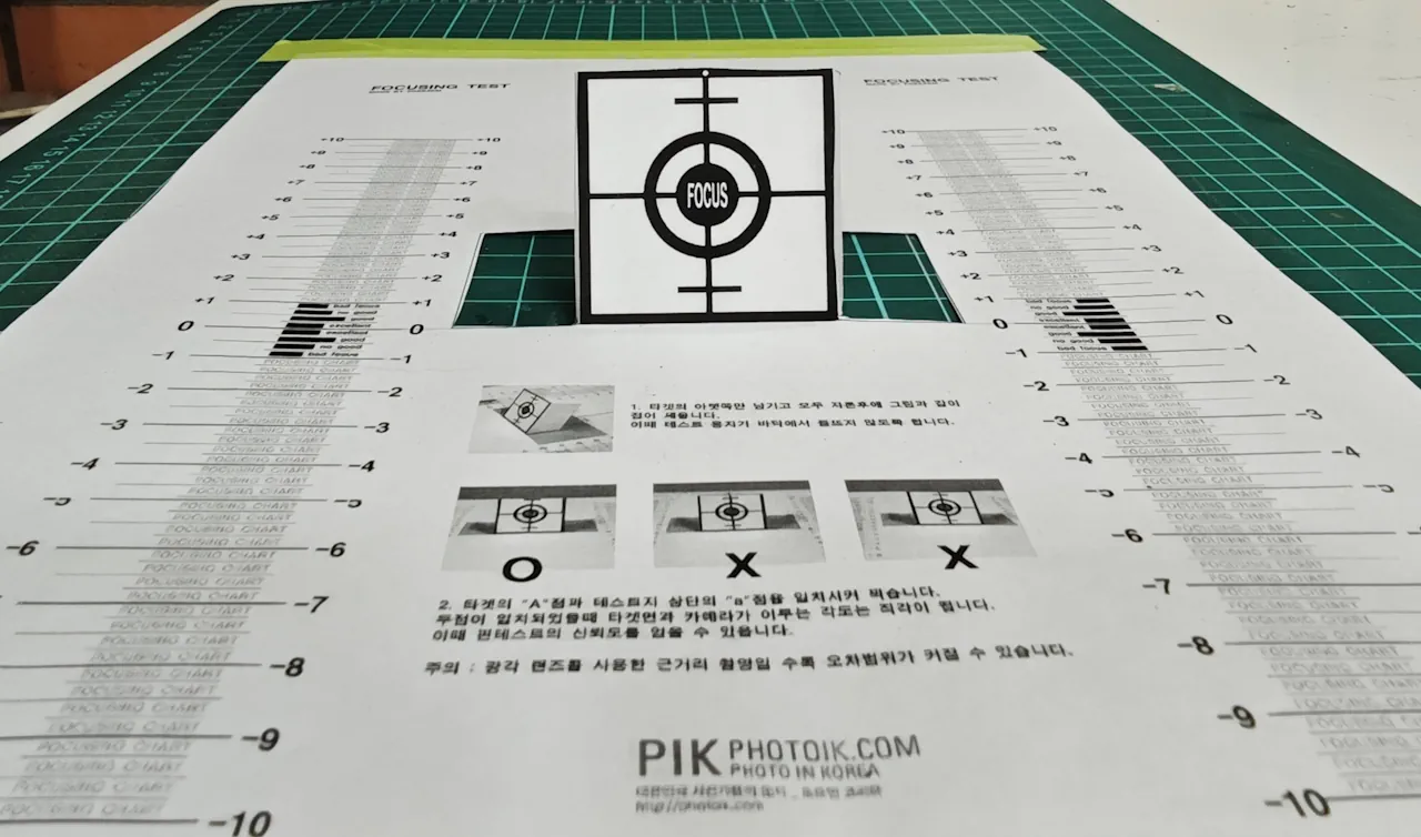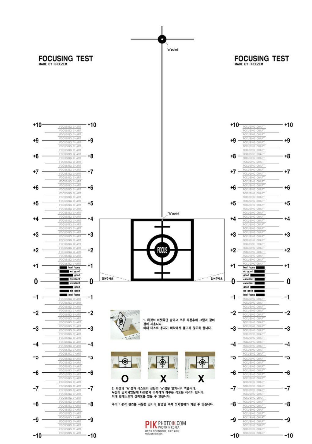 Для проверки воспользуемся не общепринятой таблицей от Focus Test Chart, а ее аналогом от корейцев (разработчик некий Freezem). Преимущество данной таблицы в выгибаемой под нужным углом мишенью для фокусировки (на самом деле там есть и мушка, и целик), благодаря которой камера имеет четкие основания для фокуса именно в этом месте, а заодно фотограф располагает камеру всегда под нужным углом. В остальном же таблица принципиально не отличается от аналогов.